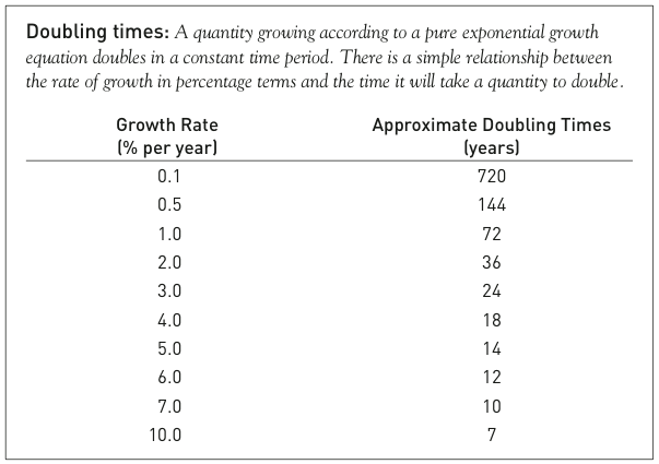 Another area of exponential growth has been the world economy. From 1930 to 2000, the money value of world industrial output grew by a factor of 14—an average doubling time of 19 years. If population had been constant over that period, the material standard of living would have grown by a factor of 14 as well. Because of population growth, however, the average per capita output increased by only a factor of five.