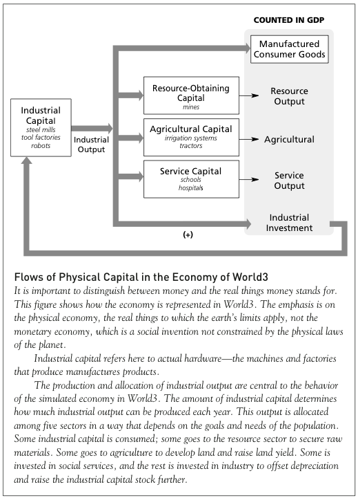 This probably makes World3 highly optimistic. It has no military sector to drain capital and resources from the productive economy. It has no wars to kill people, destroy capital, waste lands, or generate pollution. It has no ethnic strife, no corruption, no floods, earthquakes, nuclear accidents, or AIDS epidemics. The model represents the uppermost possibilities for the “real” world.