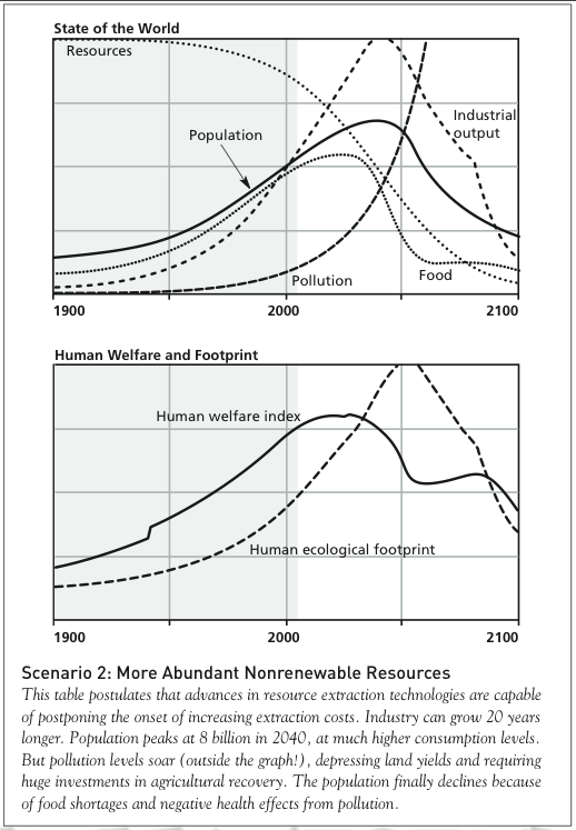 A similar scenario assumes that the world’s endowment of natural resources doubles, and further postulates that advances in resource extraction technologies are capable of postponing the onset of increasing extraction costs. Under this scenario industry can grow 20 years longer. But pollution levels soar, depressing land yields and requiring huge investments in agricultural recovery. The population finally declines because of food shortages and negative health effects from pollution.